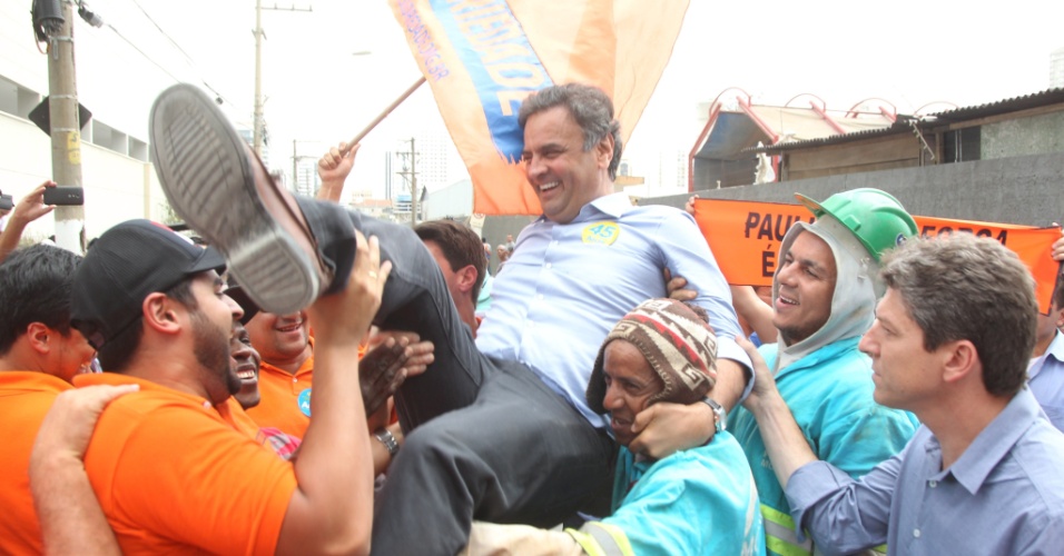 7.out.2014 - O candidato à Presidência do PSDB, Aécio Neves, foi levantado por eleitores em comemoração por estar no segundo turno das eleições 2014, durante encontro com trabalhadores da construção civil, nesta terça-feira (7), em São Paulo. Aécio reafirmou ser pessoalmente contra a reeleição, mas evitou responder se abriria mão de um segundo mandato no caso de vitória contra a presidente Dilma Rousseff (PT)Leia mais Marcos Alves/ Agência O GLobo