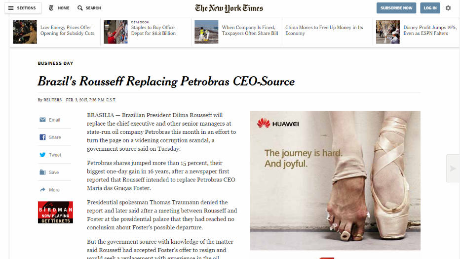 Ainda no Reino Unido, a página da emissora de televisão BBC na internet informa na capa sobre a saída dos executivos da Petrobras. Texto produzido pela equipe do canal em Londres informa que Graça Foster deixa a companhia em meio ao escândalo de corrupção que envolve fixação de preços, subornos e propinas que envolveriam o partido da presidente Dilma Rousseff.