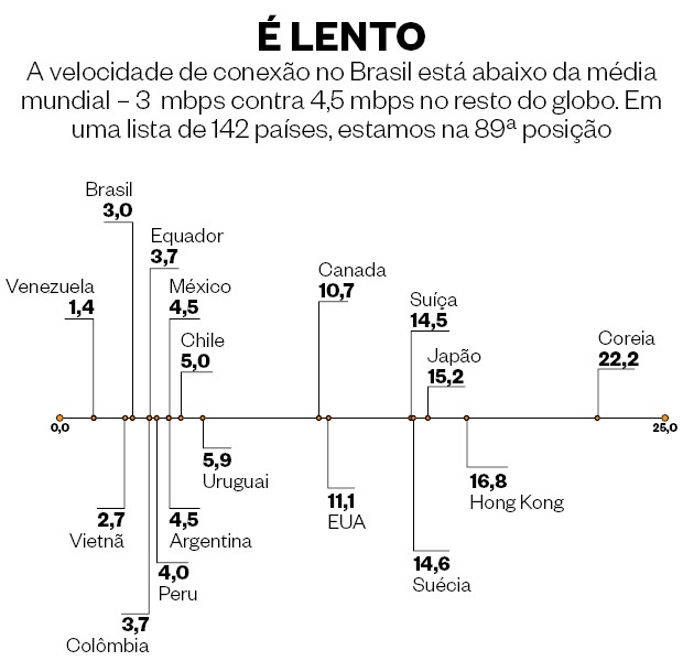 De acordo com a Akamai, a velocidade média no país é de 3 Mbps. Ela cresceu 11% entre 2013 e 2014. Mesmo assim, continua abaixo da média mundial, de 4,5 Mbps. O número deixa o país atrás de vizinhos de continente como Argentina (4,5 mbps) ,Uruguai (5,9 mbps) e Peru (4,0 mbps). E bem distante da Coreia do Sul (22 Mpbs), que lidera o ranking.