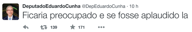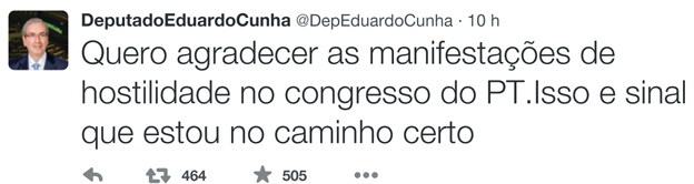 Alvejado no encerramento do 5º Congresso do PT com gritos de ‘Fora Cunha, o presidente da Câmara, Eduardo Cunha (PMDB-RJ), festejou na internet: “Quero agradecer as manifestações de hostilidade no Congresso do PT. Isso é sinal de que estou no caminho certo.” Acrescentou, em tom de alívio: “Ficaria preocupado é se fosse aplaudido lá.” E vaticinou: “O PMDB não repetirá a aliança com o PT.”
