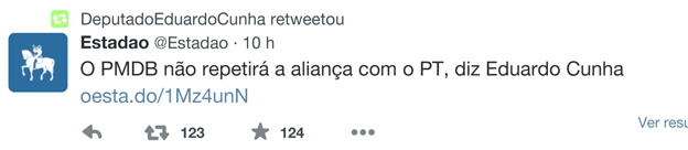 O deputado indicou aos seus seguidores no Twitter um link que conduz para entrevista que concedeu aos repórteres Daniel Carvalho e Erich Decat. Nessa conversa, disponível aqui, Cunha declarou que “está esgotado” o modelo de coalizão que tem o PMDB e o PT como sócios majoritários.