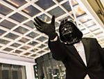 Obi-wan Kenobi? Luke Skywalker? "Não, nenhum especificamente. Até porque não me acho parecido com nenhum deles", disse o analisa de sistemas de 25 anos, brinco e cabelo escuro, que tem como primeira lembrança da saga a imagem dos ursinhos ewoks de "O Retorno de Jedi" (1983), visto nalguma sessão da tarde.
