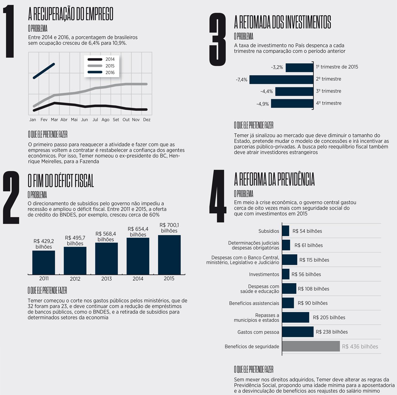 Os mais urgentes podem ser divididos em quatro frentes. O desemprego, que sufoca 11 milhões de brasileiros, fechou o primeiro trimestre em dois dígitos e isso é fruto não só da desaceleração econômica, mas também da perspectiva dos empresários, que acreditam que a crise não acabará tão cedo e começaram a demitir até os quadros mais qualificados. Com Meirelles na Fazenda, a solução de Temer passa pelo restabelecimento da confiança dos agentes econômicos e a busca pelo reequilíbrio fiscal. Mais do que isso, a nova equipe deverá atrair investidores com o incentivo às parcerias público-privadas e a mudança do modelo de concessões, fatores que deverão reaquecer a economia. O déficit fiscal, outro vilão, deverá ser combatido com um rigoroso corte nos gastos, a redução de empréstimos concedidos por bancos públicos e a retirada de subsídios. Por fim, a Reforma da Previdência pode finalmente sair do papel para estancar o rombo próximo a R$ 167 bilhões, mas com uma ressalva: os direitos adquiridos não serão afetados.