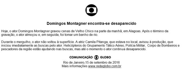 Mais cedo, a TV Globo informou que Domingos havia gravado cenas da novela durante a manhã e, depois de almoçar, foi tomar banho no rio. Como não voltou à superfície, a atriz Camila Pitanga avisou à produção, que iniciou as buscas junto às autoridades.