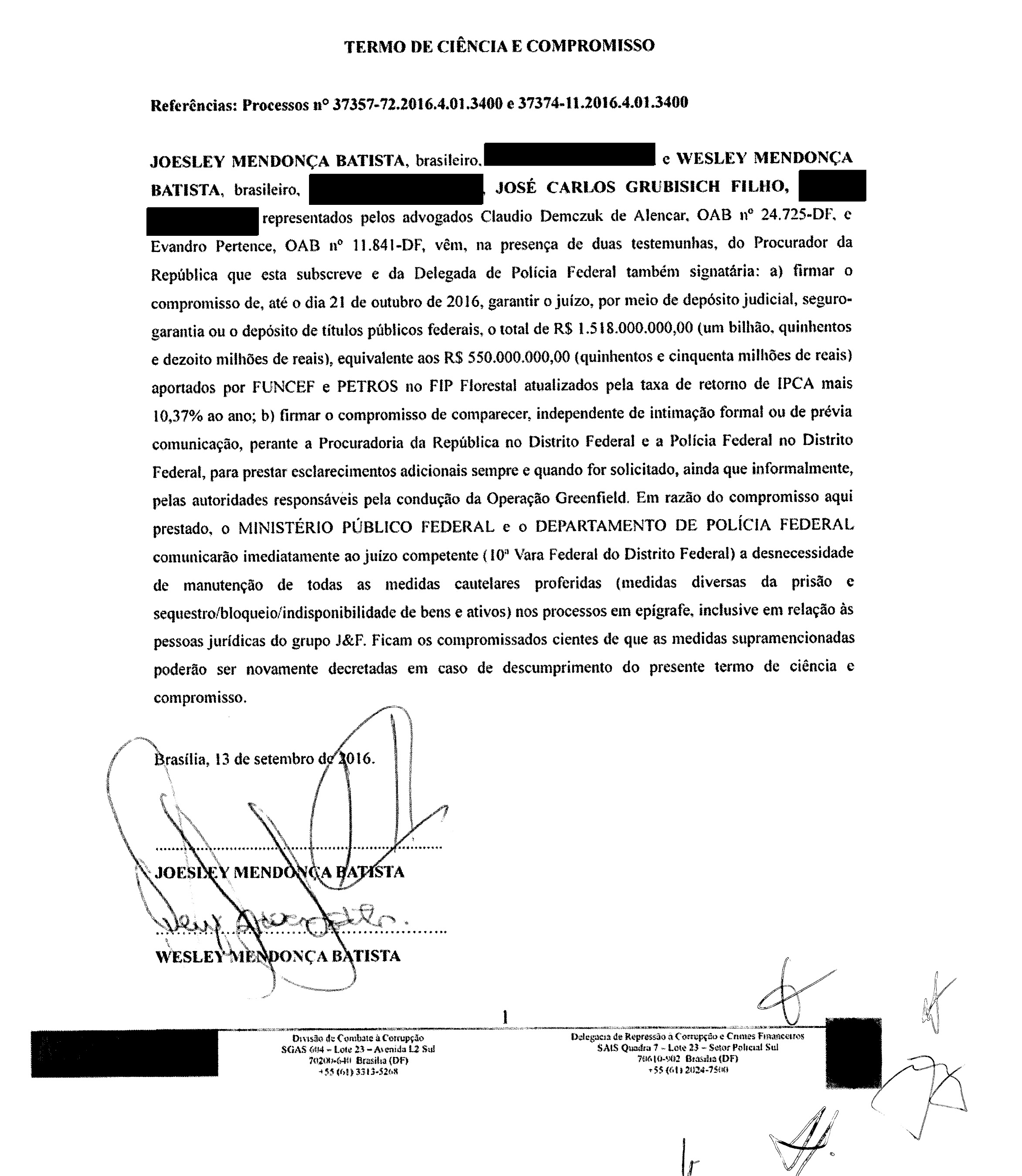Nessa investigação, apuram-se fraudes contra o patrimônio de fundos de pensão de empresas estatais. Ao final do processo, se houver condenação judicial, o dinheiro será usado para ressarcir os prejuízos. Se os barões da carne forem absolvidos, a verba lhes será restituída. Abaixo, cópia do termo de acordo (clique sobre o documento para ampliar a imagem).