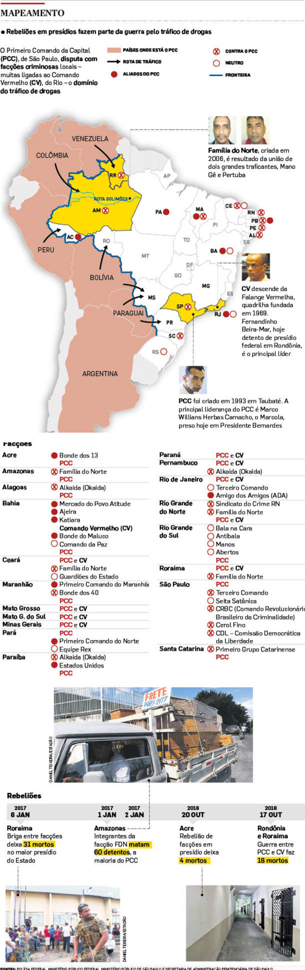 As facções criminosas Primeiro Comando da Capital (PCC) e Comando Vermelho (CV) disputam o domínio do tráfico de drogas nas fronteiras do País. Por isso, estão em guerra e buscam aliados do crime em todos os Estados. Na última semana, mais de 90 presos foram brutalmente assassinados em massacres ocorridos em penitenciárias do Amazonas e de Roraima. No total, segundo autoridades que investigam o crime organizado, pelo menos mais 25 facções criminosas participam dessa disputa, apoiando o PCC ou o CV.