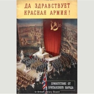 Este pôster acima diz "Vida Longa ao Exército Vermelho! Saudações do Povo Britânico". Após a recaptura de Stalingrado pelas forças soviéticas em fevereiro de 1943, o MOI organizou uma noite de celebrações na sala de concertos Royal Albert Hall, em Londres, com discursos lidos por Laurence Olivier e John Gielgud.