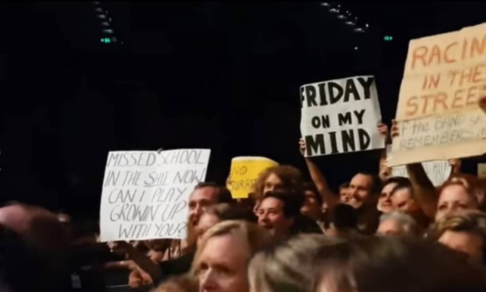 "Matei aula hoje e estou na merda. Posso tocar 'Growin' Up' com você?". Foi graças a um cartaz com esse recado que um rapaz conseguiu ser chamado para subir ao palco do show de Bruce Springsteen, na última quinta-feira, em Brisbane, Austrália.