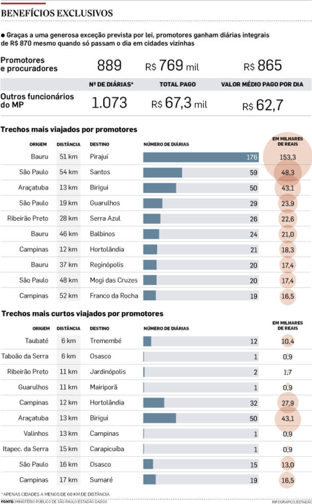 Levantamento feito pelo Estadão Dados em planilhas do Ministério Público de São Paulo (MP-SP) mostra que, em 2016, promotores e procuradores receberam 889 diárias de quase R$ 1 mil para viajar entre cidades a menos de 60 quilômetros de distância. Como o valor é fixo – refere-se a 1/30 do salário de um promotor de Justiça substituto (cerca de R$ 25 mil) – e não há limites mensais, os valores acumulados por viagens curtas chegam a atingir mais de R$ 60 mil em um ano.