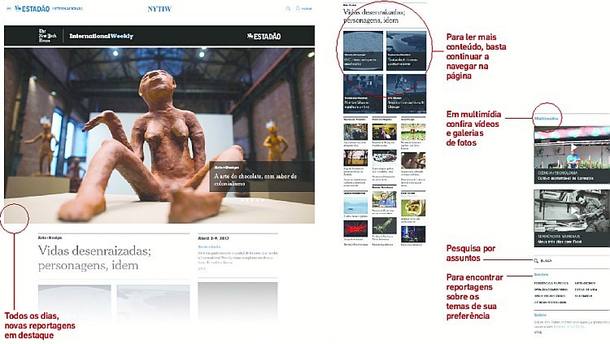 Num mundo com uma quantidade exponencial de informações – muitas inverídicas –, o Estadão investe em trazer conteúdo com credibilidade e profundidade em todas as plataformas. Serão publicadas cerca de 30 reportagens por semana, produzidas por repórteres espalhados por todo o mundo, além de vídeos e galerias de fotos, no site do Estadão. Os leitores poderão ver os destaques na página inicial do portal ou navegar pelo conteúdo de todas as editorias eminternacional.estadao.com.br/nytiw.