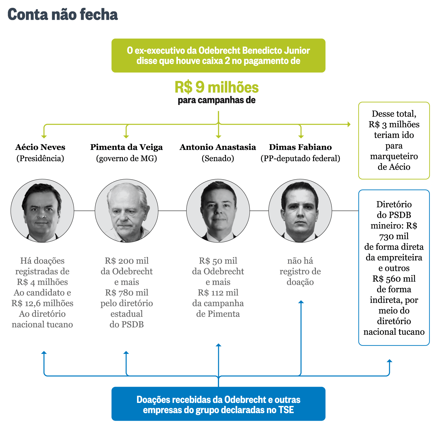 Enquanto o ex-diretor da Odebrecht Benedicto Junior afirmou que houve pagamento de R$ 6 milhões em 2014 por meio de caixa 2 para as campanhas eleitorais de Pimenta da Veiga (PSDB) ao governo mineiro, Antonio Anastasia (PSDB) ao Senado e Dimas Fabiano (PP) a deputado federal, o montante declarado pelos candidatos e pelo PSDB mineiro ao Tribunal Superior Eleitoral (TSE) como doações recebidas das empresas do grupo foi de apenas 25% deste montante, R$ 1,5 milhão.